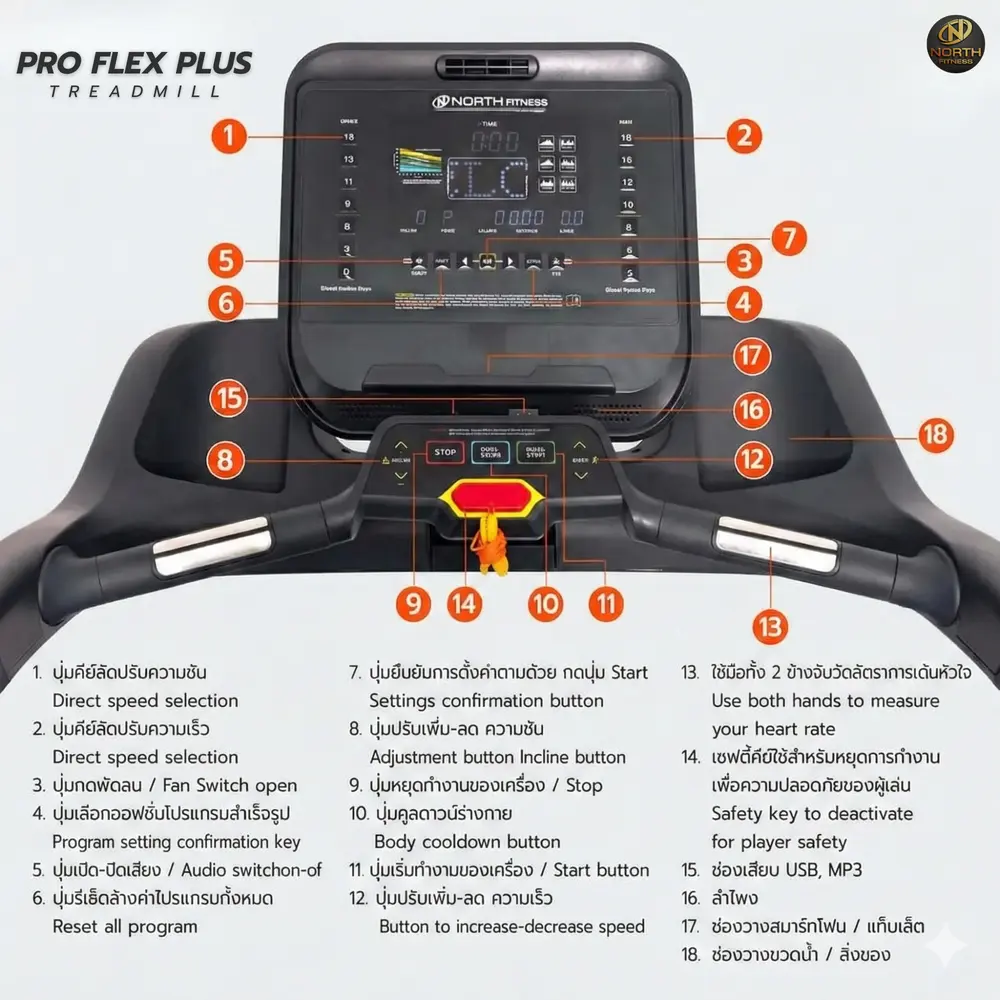 ลู่วิ่งไฟฟ้า North Fitness รุ่น Pro-Flex วัดชีพจรด้วยระบบแฮนด์เพาส์ ทั้งด้านซ้ายและด้านขวาตำแหน่งราวจับ มีระบบความปลอดภัย Safety key (ปูมหยุดฉุกเฉิน) และ หน้าจอแสดงผล เวลา, ความเร็ว, ความลาดชัน, ระยะทาง,แคลอรี่, อัตราการเต้นของหัวใจ